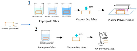 - Ermeydan, M.A. Modification of spruce wood by UV-crosslinked PEG hydrogels inside wood cell walls. React. Funct. Polym. 2018, 131, 100–106. [Google Scholar] [CrossRef]