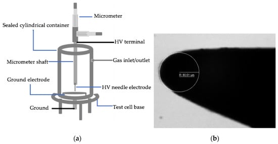 (a) Schematic diagram of the test cell (not in scale) with the needle-plane electrode configuration; (b) photograph of the gramophone needle tip with ~80µm radius under the microscope.