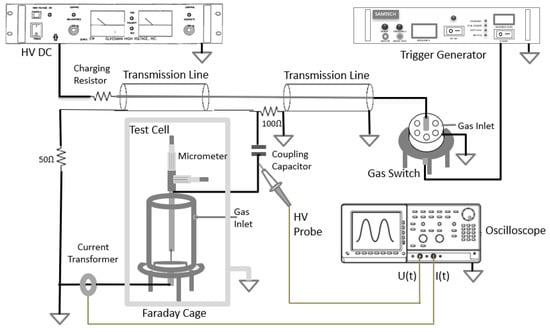 Figure 2 provides a schematic diagram of the experimental test system including the HV pulsed power supply and the test cell. The pulsed power supply used in this study was a custom-built Blumlein generator, made of two sections of URM67 coaxial cable (indicated as “transmission lines” in Figure 2, each 25 m long). The Blumlein generator was charged by a Glassman HV DC EH50P2 power supply (Glassman High Voltage Inc, High Bridge, NJ, USA), which is capable of supplying DC voltages up to 50 kV, through a 100 kΩ charging resistor. The air-filled trigatron (spark-gap switch) was triggered using pulses of up to ~37 kV, produced by a Samtech TG-01 (SAMTECH Ltd., Glasgow, Scotland) trigger generator. A 245 pF capacitor was used to couple the output of the Blumlein generator with the test tell; two matching resistors (50 Ω and 100 Ω) were used to form the required wave-shape of the HV impulse across the load (the gas-filled test cell).