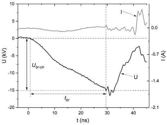 Figure 3 shows typical voltage and current waveforms obtained for breakdown in air at 304 kPa. The voltage Ubr-ch was measured at the time of the first significant transient pre-breakdown disturbance (spike) in the current waveform. The observed current disturbances are the result of the development of fast ionization front(s) (streamers) in the inter-electrode gap [27,28]. It was established that a noticeable spike in the pre-breakdown current corresponds to the development of the main streamer after the initial streamer(s) crossed the gap, or when cathode- and anode-directed streamers meet each other in the gap, forming the initial body of the breakdown plasma channel, [29].