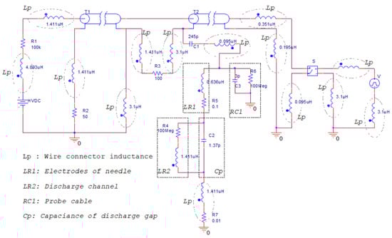 In Figure 4, the needle-plane is represented by an inductor and resistor connected in series, and this electrode system is indicated as LR1. The LR2 block in Figure 4 represents the spark discharge channel. CP represents the capacitance of the gap formed by the needle and plane electrodes, and the value of this capacitance, 1.37 pF, was obtained by simulating the needle-plane configuration in QuickField software. The HV probe is modelled as a resistor and capacitor connected in parallel (block RC1 in Figure 4)—the numerical values of for the resistance (100 MΩ) and capacitance (3 pF) of the Tektronix P6015A HV probe are provided in [31].