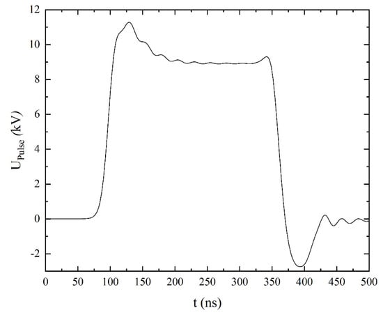 Impulse voltage waveform across the needle-plane electrode system, obtained by the model shown in Figure 4. The charging voltage applied to the Blumlein generator was 10 kV.