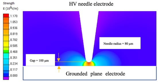 The Laplacian electric field in the needle-plane topology with a gap separation of 100 µm was simulated using QuickField electrostatic software. The axisymmetric model allows the field distribution to be obtained for a virtual 3D case, and the resulting field distribution is shown in Figure 6.