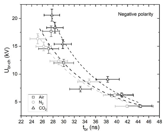 The breakdown voltage, Ubr-ch, as function of tbr, negative polarity: ☐—air; ○—N2; △—CO2. Dashed lines show fitting curves for each gas obtained by Equation (3).The error bars show the 95% confidence interval in the breakdown voltage and time to breakdown.