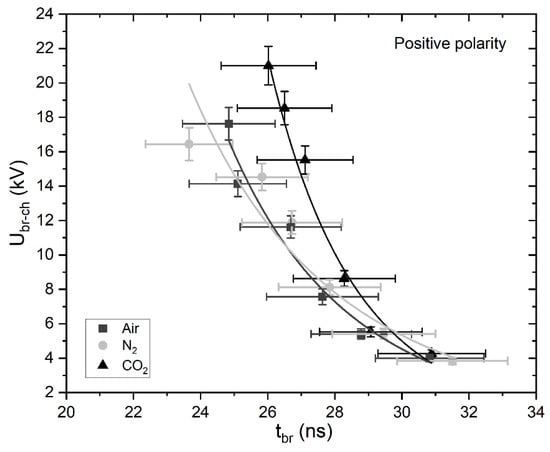 The breakdown voltage, Ubr-ch, as function of tbr, positive polarity: ■—air; ●—N2; ▲—CO2. Solid lines show fitting curves for each gas obtained by Equation (3). The error bars show the 95% confidence interval in the breakdown voltage and time to breakdown.