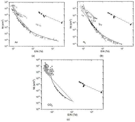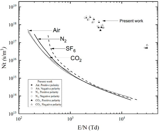 Figure 11 shows Nt as a function of E/N for air, N2 and CO2 and includes: the results obtained in the present work (Ntbr as a function of Etip/N), the kinetic model results (Ntf as a function of E/N), and the results previously published in the literature, [10,11,22,23,24], and [34,35,36,37]. Each experimental point shown in Figure 11 represents the average value obtained using 20 individual data points, the error bars show the 95% confidence interval values, (some original experimental points do not appear to have error bars as a result of these bars being too small to display relative to the size of the point). The literature data are based on both formative and (in some cases) total time to breakdown and were obtained under various experimental conditions (type of electrodes, inter-electrode distances, gas pressures, high-voltage pulse characteristics). Details of each specific set of experimental conditions can be found in [10,11,22,23,24,34,35,36,37].