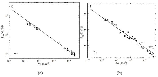 In Equation (6), Nd is expressed in units of 1/m2 and Etip/N is expressed in units of Td. The numerical values of the fitting parameters, C and D, obtained in OriginPro graphing software for each gas are given in Table 2.