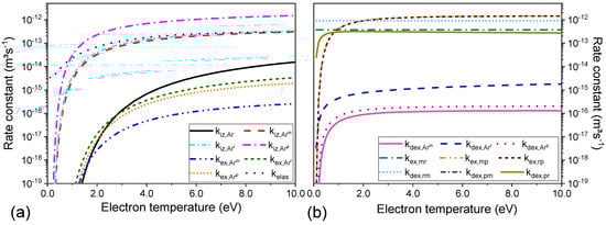 The rate constants of electron impact reactions are plotted in Figure 2 as a function of electron temperature and listed in Table 1. Figure 2a shows the rate constants of reactions R1–R8 and Figure 2b of R9–R17 of Table 1.