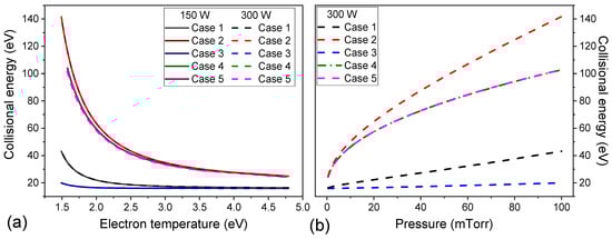 Collisional energies obtained for all cases as a function of electron temperature for absorbed powers of 150 W and 300 W, at a gas pressure range of 0.5–100 mTorr, are shown in Figure 3a. When the absorbed power is changed from 150 W to 300 W, the collisional energy dependence on electron temperature is similar for all cases, but the magnitude is different for each one. Collisional energy is unaffected by absorbed power because it also does not affect the electron temperature (Figure 4). On the other hand, for the same absorbed power, the collisional energy decreases with electron temperature (Figure 3a) and increases with gas pressure (Figure 3b). This inverse dependence occurs because the electron temperature decreases with increasing gas pressure (Figure 4). However, even with collisional energy changing for each case, the electron temperatures calculated are close.