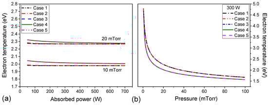 Electron temperature as a function of absorbed power at 10 mTorr and 20 mTorr (a) and gas pressure at 300 W (b) for the five cases studied.