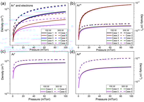 The electron and Ar+ (a), Arm (b), Arr (c), and Arp (d) species density for all cases as a function of pressure at absorbed power of 300 W. The density of ions and electrons are the same due to the quasi-neutrality. Arr and Arp are not considered in the particle balance in cases 1–3.