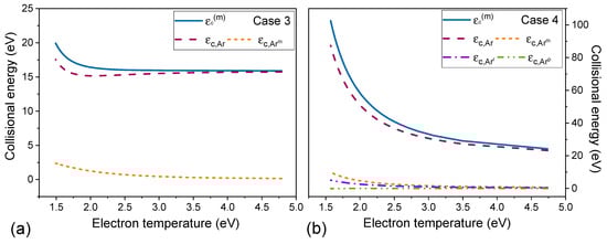 For case 1, the electrons spend energy to ionize and excite the ground state argon producing Ar+ and Arm, respectively, and in elastic collisions (Table 2). In case 2, electrons also can excite ground state argon atoms to Arr and Arp (Table 2). Thus, more energy is lost between two consecutive ionizations, and the collisional energy increases for the same electron temperature as can be seen in Figure 3 for typical values of ICP temperature between 2.0 eV and 3.0 eV [34,48].