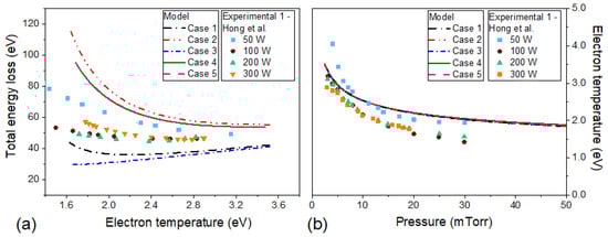 The total energy loss as a function of electron temperature (a) and electron temperature as a function of gas pressure (b) for the 5 cases studied. The model results are the same for all absorbed power values in the simulated range (50 W a 600 W). The data points are relative to experimental data at different absorbed power of Hong et al. [29]. The simulations (lines) were performed with the input parameters: R = 13 cm, L = 12 cm, Tg = 300 K and .