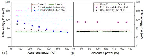 The total energy loss as a function of absorbed power at 10 mTorr for cases 2 and 4. In (a), the squares are experimental data of Lee et al. [33,34]. The simulations (lines) were performed with the input parameters: R = 19 cm, L = 30 cm, Tg = 300 K and at 10 mTorr. In (b), the circles are experimental data and calculated results of Kim et al. [36]. Here, the simulations (lines) were performed with the input parameters: R = 13 cm, L = 10 cm, Tg = 300 K and at 25 mTorr.