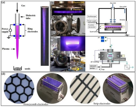 CAP has been studied for many years, and multiple generators have been invented. The most popular hardware includes the Cold Atmospheric Plasma Jet (CAPJ), Dielectric Barrier Discharge (DBD) reactor, radiofrequency (RF) reactor, and surface DBD source [6]. To avoid arc discharge, either the anode or cathode will be covered by a layer of dielectric materials such as glass, quartz, ceramic, or others [7]. Noble gases such as helium (He) and argon (Ar) are used to trigger the stable and nonthermal glow-like discharge in CAP sources [8]. For the CAP jet, the samples do not involve the discharge process (Figure 1). Thus, the CAP jet is an indirect discharge source [9]. In contrast, the DBD source is a direct discharge source, in which samples such as seeds are involved in the discharge process [10]. Compared with the CAP jet, DBD plasma has a short length but can affect a much larger area simultaneously. However, the nature of the CAP jet makes it so that it has a high aspect ratio and can even reach 11 mm of length [11]. Thus, the DBD reactor is more suitable for a large area treatment compared to the CAP jet. Similarly, surface DBD is a unique DBD configuration, in which two electrodes have been integrated in one surface [12]. Such a design overcomes the sample areas’ three-dimensional space limitation. Even a large sample can also be treated by a surface DBD source. The discharge in a radiofrequency (RF) plasma reactor is based on the RF power input between two electrodes, rather than AC or DC power [10]. Typically, RF plasma generates in a chamber, where samples such as seeds are set in the gaps between electrodes.