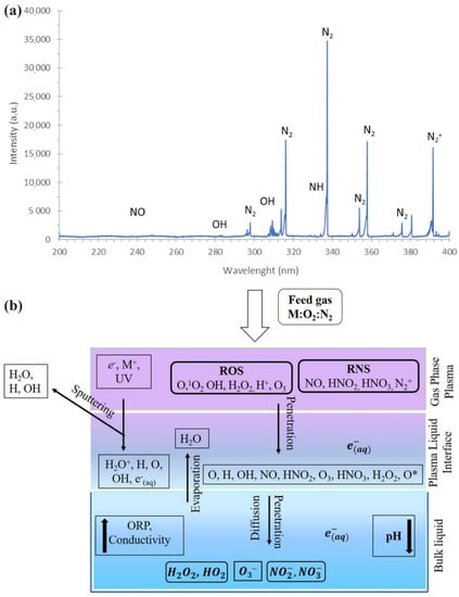 Reactive species in gas phase and liquid phase. (a) An emission spectrum of plasma in the gas phase of DBD in the range from 200–400 nm [17]. (b) General picture of CAP-aqueous solution interactions. Reprinted with permission from Ref. [20]. Copyright 2019 John Wiley and Sons.