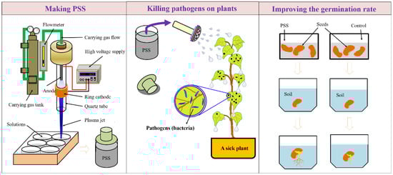 In addition to the direct CAP treatment on plants or seeds, aqueous solutions (particularly, water) have been used as the carriers for the CAP-originated reactive species through CAP treatment on these solutions [39,58,59,60,61,62,63,64,65,66,67,68,69]. CAP-stimulated solution (PSS) can be widely used in many circumstances independent of CAP devices (Figure 4). PSS was also named as CAP-activated solution (PAS) or water (PAW) in some references [46,70,71,72]. PSS contains an abundance of reactive species and has promising applications in agriculture. PSS has been shown to have a strong killing effect on bacteria [46,70,71,72] and viruses [41,73,74].