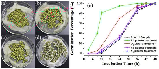 Air plasma drastically improved the germination rate of mung bean seeds. (a) 0 h, (b) 9 h, (c) 12 h, (d) 24 h, and (e) the germination percentage of mung bean seeds treated with He, N2, air, or O2 plasma as a function of incubation time [93].