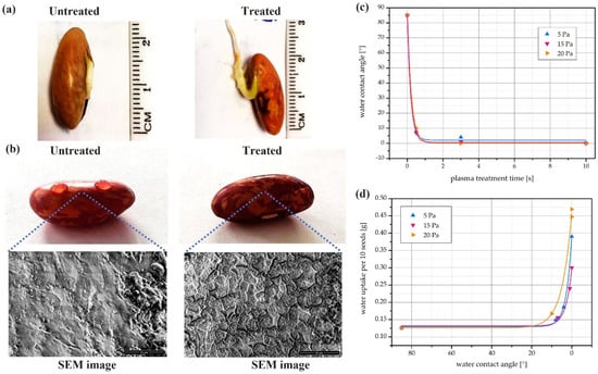 CAP treatment improved the water uptake of bean seeds. (a) Visual bean seed radicle length after 4 days of incubation. (b) Water droplets on untreated and treated bean seed. SEM images of seeds’ surface were shown below. (c) The effect of plasma treatment on water contact angle on seed’s surfaces. (d) The effect of plasma treatment on water uptake of seeds [109].