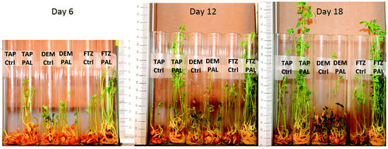 The effect of CAP-treated tap water on lentil seeds’ seedling. Pictures showing lentil seeds and seedlings on days 6, 12, and 18 after treatment. TAP: tap water, DEM: demineralized water, FTZ: liquid fertilizer, Ctrl: control, PAL: plasma activated liquid [59].