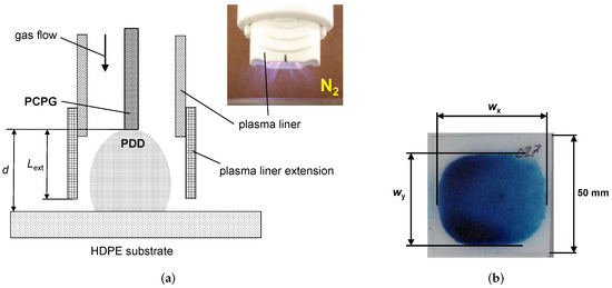 Surface activation. (a) Setup for activation of the polymer substrate surface, where the distance d means the distance between the substrate and the tip of the PCPG, is the effective length of the plasma liner extension, and (b) is the visualization of a typical activation area with SFE ≥ 58 mN/m produced by 10 s nitrogen PDD at a distance mm, nitrogen flow of 8 SLM and PCPG input power of 8.0 W.
