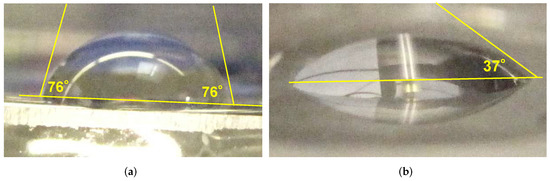 Double-distilled water is used to produce the test droplets of about 4 L on the substrate surface. The droplets are dispensed at the surface position corresponding to the symmetry axis of the PCPG during treatment. The side-view macroshots are made with a Canon G10 digital camera, and the contact angles are determined graphically, as shown in the examples presented in Figure 2.