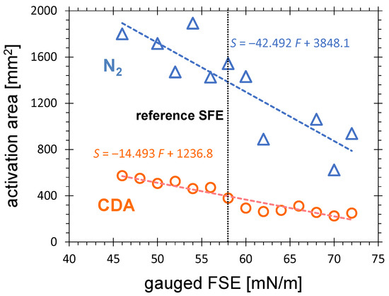 The chemically active species causing the surface activation are not distributed homogeneously across the plasma plume of the APPJ. Therefore, the SFE varies across the activated zone. Applying the test inks gauged with different SFE, ink patches of different size are obtained. Figure 4 shows the visualized activation area obtained by PDD treatment of HDPE for air and nitrogen as a function of the SFE gauged by the test inks. Considering the fitting lines, the size of the visualized activation area is is more than double when the 46 mN/m test ink is taken instead of the pure water-based 72 mN/m test ink. The visualized area for 46 mN/m is 37% larger than for 58 mN/m. In the investigated FSE range, the activation area for nitrogen is a factor 3.3 for 46 mN/m to 4.1 for 72 mN/m larger than for CDA. For different applications, different minimum SFE levels are required and used for definition of the activation area.