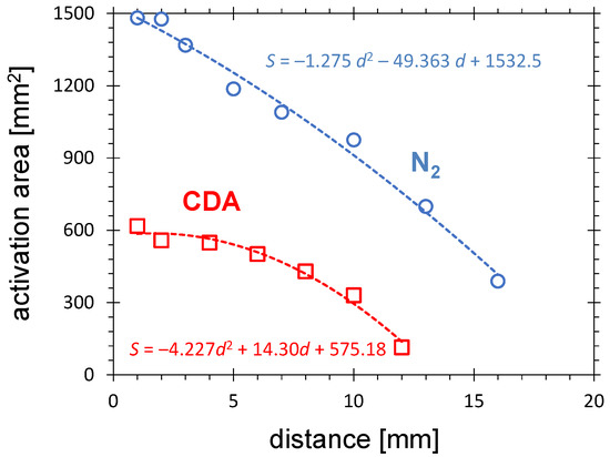 Using the fitting formulas from Figure 5, the distance at which the activation area vanishes can be estimated. It is 13.5 mm and 20.4 mm for CDA and nitrogen, respectively. These values are slightly larger than the sizes of the primary discharge estimated on the basis of the PDD pictures in Figure 3.