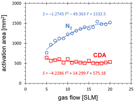 The dependence of the activation area on the nitrogen flow is quite different compared with the CDA curve. Figure 6 shows that the surface area doubles when the nitrogen flow increases from 5 to 20 SLM. In the same flow range, a slight decrease in the activation area for CDA is observed.