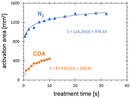 Figure 7 shows the time dependence of activation area on treatment time for CDA and nitrogen respectively. Both curves show a monotonous increase with treatment time and saturation for longer treatment. This limitation is observed for different types of APPJ [57,70] and can be explained by three mechanisms: (i) increasing dilution of the chemically active species in the ambient air with increasing distance from the nozzle opening blowing the plasma gases, (ii) the decrease in the concentration of the short-living chemically active species with flow time due to recombination and quenching processes, and (iii) the decrease in the CeraPlasTM F electric field with increasing distance from the PCPG tip.