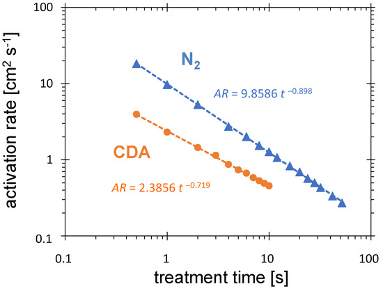 The activation rate calculated according to Equation (1) as a function of the treatment time is shown in the double-logarithmic coordinate system in Figure 8. Both curves, for CDA and for nitrogen, show a drastic increase in the activation rate with decreasing treatment time. The maximum static activation rates measured for 0.5 s treatment time are 4.0 cm s and 18.2 cm s for CDA and N PDD, respectively. For 10 s treatment, these values are 0.46 cm s and 1.28 cm s, respectively. Furthermore, the ratio of activation rate for nitrogen and CDA is decreases from 4.7 to 2.7 with treatment time growing from 0.5 to 10 s.