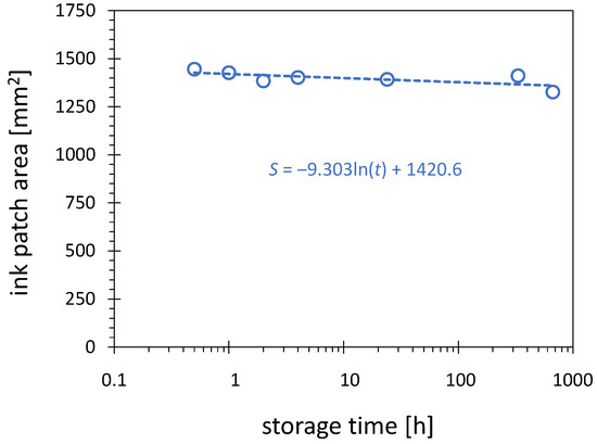 Despite the hydrophobic recovery documented for HDPE in the literature on the basis of SFE or contact angle, no significant reduction in the activation area can be observed after storage of the activated substrates over an extended period. The results in Figure 9 document the changes over 668 h. During 24 h of storage, only a minor decrease of the activation area is observed, by less than 4%. This result is not contradictory to the previously reported hydrophobic recovery results, because those are related mainly to the decrease in the maximum value of the SFE reached after plasma treatment. The SFE of 58 mN/m used as a threshold for visualization in this work is much lower than the maximum value of SFE obtained after treatment, reaching an SFE of up to 72 mN/m. The contours with 58 mN/m do not have to be affected much by the decline of the maximum SFE and shrinking of the contours with values larger than 58 mN/m. It is also worth mentioning that the PDD-treated substrates are stored in a dark place, which reduces the hydrophobic recovery.