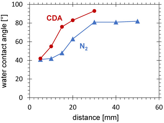 The results for CDA are included in Figure 10 for comparison. The contact angle for CDA in the entire investigated distance range is higher than for nitrogen. It increases rapidly much closer to the PCPG, exceeds 80 at 20 mm, and reaches a maximum of 93 at 30 mm. As already discussed in Section 3.1.1, the activation disappears much closer to the PCPG than for nitrogen due to fast quenching of the metastable excited species at high oxygen concentrations.