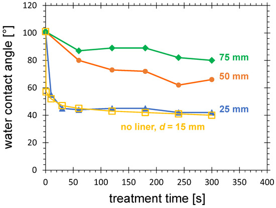 Water contact angle measured at the HDPE substrate surface after nitrogen PDD treatment as a function of treatment time for 3 different lengths of the plasma liner extension, and without plasma liner at 15 mm, as specified in the diagram, and the distance between the plasma liner extension and the substrate of 2 mm. Further treatment parameters are the PCPG input power of 8.0 W, and the gas flow of 10.0 SLM.