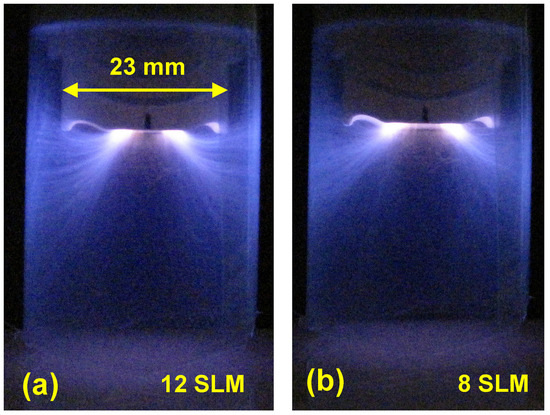 The PDD in (a) CDA, the camera exposure time was 1 s, and (b) in nitrogen, the camera exposure time was 0.3 s, for PCPG power of 8.0 W, gas flow of 8 SLM, and distance of 20 mm. The lens aperture for both pictures was 2.8.