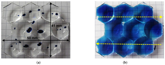 Figure 1b shows the visualization of the zone activated on the surface of the HDPE substrate using the setup shown in Figure 1a. The 58 mN/m test ink is chosen to ensure that the ink is only wetting the activated surfaces and rolls off the nontreated surface areas. The width of the activation zone (see the symbols in Figure 1b) is larger than the width , following the elongated shape of the PDD caused by the rectangular geometry of the PCPG tip.