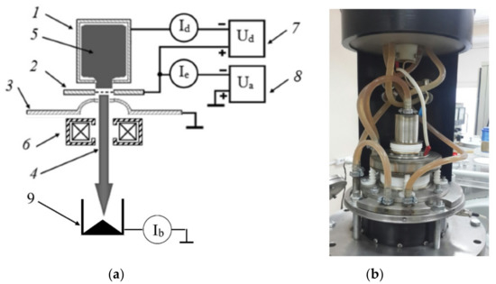 The experiment was carried out using a fore-vacuum-pressure, plasma-cathode electron source utilizing a hollow cathode discharge. The main elements of the source and a photograph are shown in Figure 1a,b.