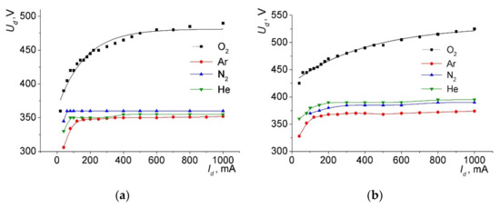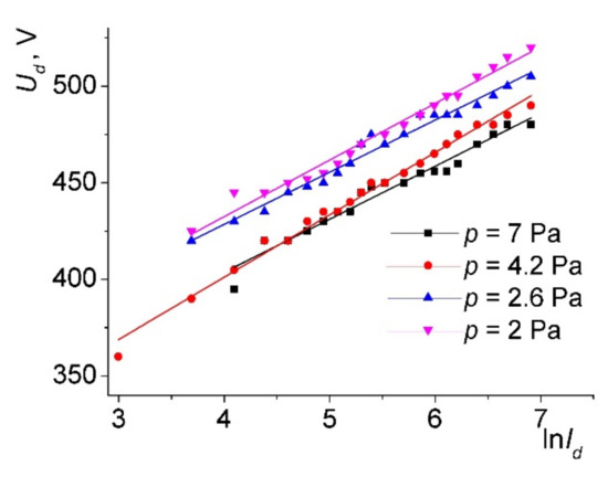 Figure 2 shows the current–voltage characteristics (CVC) of the hollow cathode discharge, which served as a plasma generator in the electron source. In Figure 2, 4–6 curves drawn through the experimental data points were obtained by spline interpolation. The resulting form of the current–voltage characteristic (Figure 2) is similar to the glow discharge used in discharge-emission systems with various configurations [13,14,15]: the discharge voltage increases with increasing current, and voltage saturation is observed. For nitrogen, argon, and helium as the working gases, the CVC became almost horizontal when the discharge current exceeded 100 mA. A different behavior was observed for oxygen—the voltage increased monotonically with the increasing current. Moreover, the dependence of the current on the voltage had an exponential character (Figure 3), which was confirmed by a linear approximation of the dependencies on the graph at coordinates lnId, Ud. This different kind of characteristic can be explained as follows. For the argon, nitrogen, and helium, a normal glow discharge regime was produced, characterized by the invariance of the voltage with the increasing current. When applied to a discharge with a hollow cathode, this may mean gradual filling of the cathode cavity with plasma. A different behavior in the case of oxygen can be considered as an anomalous glow discharge, in which an increase in voltage is required to increase the current, so that each electron ejected from the cathode wall due to ion-electron emission can produce a greater number of ionization events, thereby increasing the plasma density. Moreover, at least a part of these ionization events was carried out in the sheath, due to which these electrons had time to gain sufficient energy for ionization. In other words, the conditions for avalanche electron multiplication were created. The fact that the discharge voltages in the oxygen noticeably exceeded the analogous values of the other gases was apparently due to the formation of oxides on the electrode surfaces. In turn, the higher voltages meant a greater sheath thickness between the plasma and the cathode wall, which ensured ionization in the sheath.