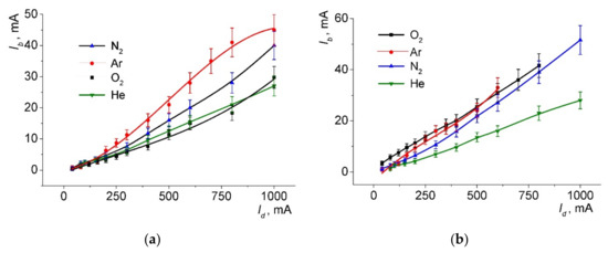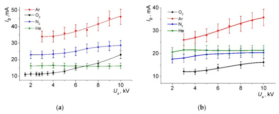 The dependencies of the beam current on the accelerating voltage are shown in Figure 4. As can be seen, growing characteristics were observed for the oxygen, argon, and nitrogen, and the characteristics for the oxygen and argon had the greatest slope. The slope of the characteristics decreased with the decreasing gas pressure (Figure 4b). For the helium, the beam current remained unchanged over the entire range of the accelerating voltage. At the same discharge currents and at accelerating voltages above 7 kV, for greater pressure (Figure 4a), the electron beam current increased in the following order: He, O2, N2, Ar. Figure 5 shows the dependence of the beam current Ib on the accelerating voltage Ua for various discharge currents Id in oxygen. All the curves have the same form, which may indicate the same mechanism for the increase in Ib with increasing Ua. The dependencies of the beam current Ib on the discharge current Id were close to linear (Figure 6). The relationship between the beam currents was the same as in Figure 4. The largest currents were observed for the argon, and the smallest for the helium.