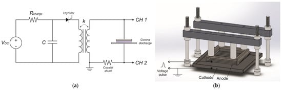 A (positive) pulsed corona discharge in open air in contact with liquid was used in the experiments. The discharge was powered with a capacitive pulsed source, capable of delivering voltage pulses with a time-width of ~100 ns, an amplitude of ~10 kV, and a pulse repetition frequency of ~42 Hz. The operation of the source is based on the charging of a capacitor bank (C = 224 nF) to a voltage level of 1500 V, which is in turn discharged by a thyristor onto a pulse transformer with ferrite core (Figure 1a).