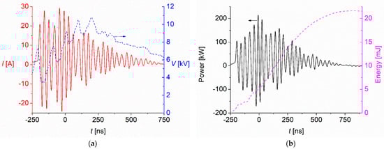 (a) Voltage and current pulse waveforms of the discharge (arrow indicates the voltage scale); (b) instantaneous power and energy dissipated in the discharge (arrow indicates the power scale).