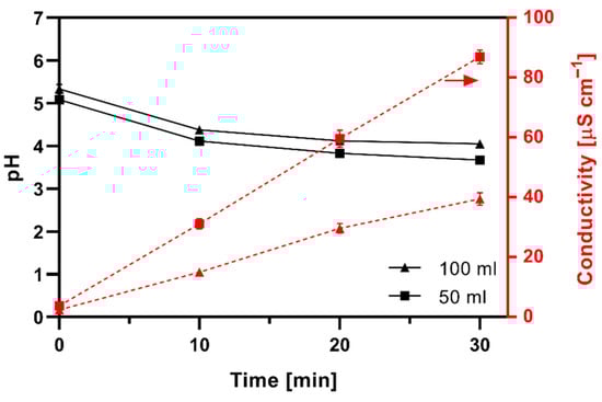 The electrical conductivity increased significantly with treatment time for both volumes studied with an approximately linear dependence. For the 50 mL volume, the conductivity reached a significantly higher value, close to double, compared to 100 mL for all plasma exposure times. This is expected due to the higher level of gas–liquid interaction at the interface area in the thinner water layer. The increase in conductivity with plasma exposure time is associated with acidic effects and the formation of NO2− and NO3− ions in water [17].