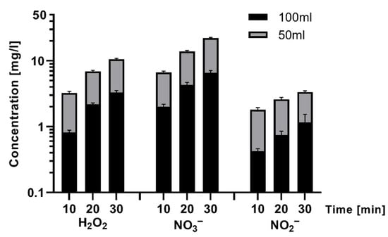 Concentration of the reactive species as a function of treatment time (min) with plasma for two sample volumes (50 and 100 mL). Two-way ANOVA, p < 0.05.