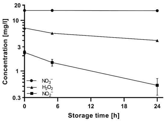 A significant decrease in hydrogen peroxide from 7.1 mg/L to 4 mg/L was observed after 24 h of storage time (Figure 5). Other authors [25,26] have documented decreases in hydrogen peroxide concentration after storage of plasma-treated solutions for 24 h. A significant drop in NO2− concentration from 2.3 mg/L to 0.5 mg/L at 24 h was also observed. Previous studies have also reported a significant decrease in nitrite and an increase in nitrate concentration after 48 h [25] or 7 days of storage [26]. The NO2− to NO3− disproportionation reaction is as follows [17]: