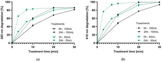 IC degradation immediately after discharge (0 h) and after 24 h of storage (24 h), as a function of treatment time (0–30 min), for two volumes of water (50 and 100 mL) at 285 nm (a) and 610 nm (b).