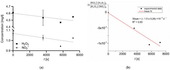 where the zero subscript indicates species concentrations at t = 0 in the postdischarge. The experimental data for this analysis were used from post-treatment evolution of [NO2−] and [H2O2] in a sample volume of 50 mL of PAW treated for 20 min (Figure 7a). The plot of (10) as a function of the time together with the corresponding linear fit is presented in Figure 7b.