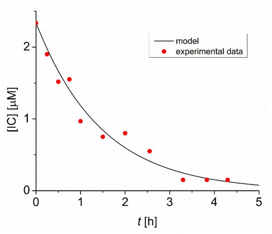 Since the timescale for the IC degradation under the given conditions (~1 h) is very large compared to the lifetimes of OH˙ and O=NOOH (the decomposition rate of O=NOOH is 0.13 + 0.87 [H+], s−1 [29]) it is reasonable to assume that such species are in instantaneous equilibrium (i.e., the accumulation terms in (12) and (13) are taken as zero). Under such assumption, (11) can be rearranged as [13]: