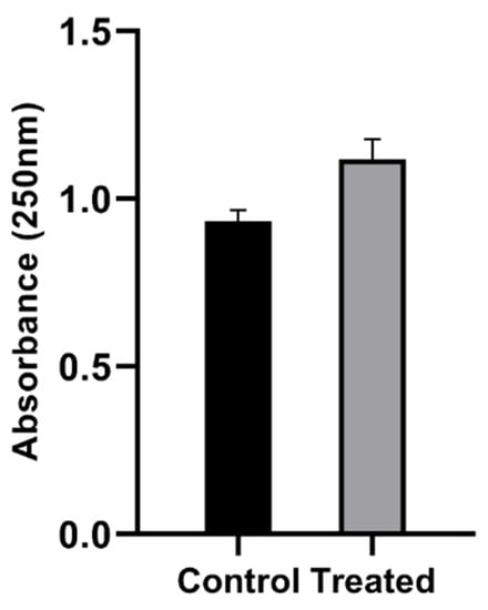 Absorbance at 250 nm of 50 mL samples untreated (Control) and treated with plasma for 30 min (Treated). Student’s t-test, p < 0.05.