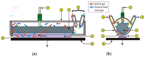 Our plasma applicator contains an inner metallic electrode (1) covered by a quartz tube (or other insulating material) mounted coaxially in an outer shell (2) made from a good dielectric material (Figure 1a). This outer shell has the job to swirl the feed gas flow around the inner electrode (1) on its longitudinal axis. As the gas moves from the input ports (3) towards the end of the applicator’s outer shell, a part of it escapes through the linear nozzle (4), which is milled on the lower side of the outer shell (2). This escaping and sweeping gas curtain (or pellicle) forms the plasma column (5) which acts on the treated material’s surface [14].