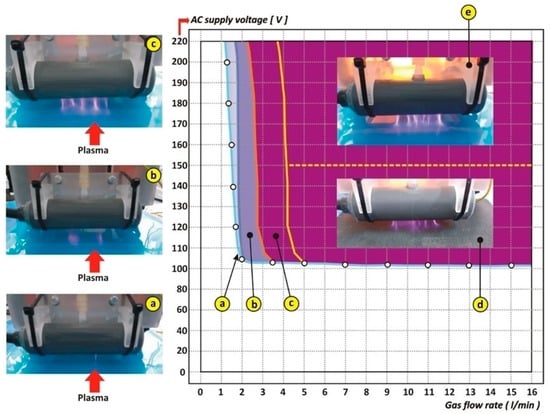 The region on the diagram defined by gas flow rates lower than 1 L/min and for any supply voltages is called a no plasma zone because under these operational parameters we cannot initiate the plasma discharge. For the supply voltage levels over approximately 100 V and gas flow rates higher than 1–1.3 L/min, the plasma starts to initiate and has the appearance of thin breakdown of unstable filaments (Figure 3a). This initial plasma regime is marked on the stability diagram with the hollow white circles.
